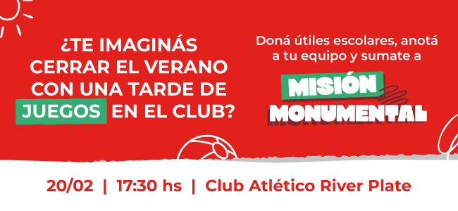 Este 20 de febrero de 2026, a partir de las 17.30, Fundación River te invita a cerrar las vacaciones en el Club con Misión Monumental, una tarde de juegos y premios para compartir en familia y disfrutar de River desde otro lugar.